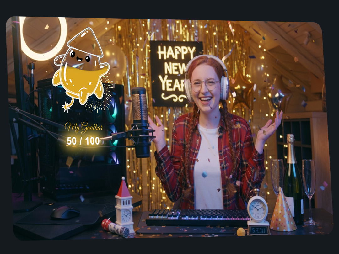 Kick off the celebration with the Chibi Rocket Goal Bar! This adorable firework-inspired design brings energetic New Year’s vibes to your stream, turning every milestone into a moment worth celebrating. Its cute chibi style and explosive liquid animation make it the perfect way to motivate your community as you launch into a fresh year of streaming success.