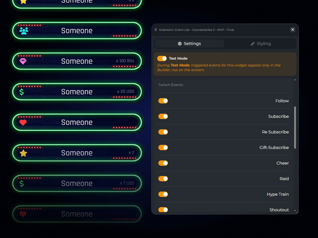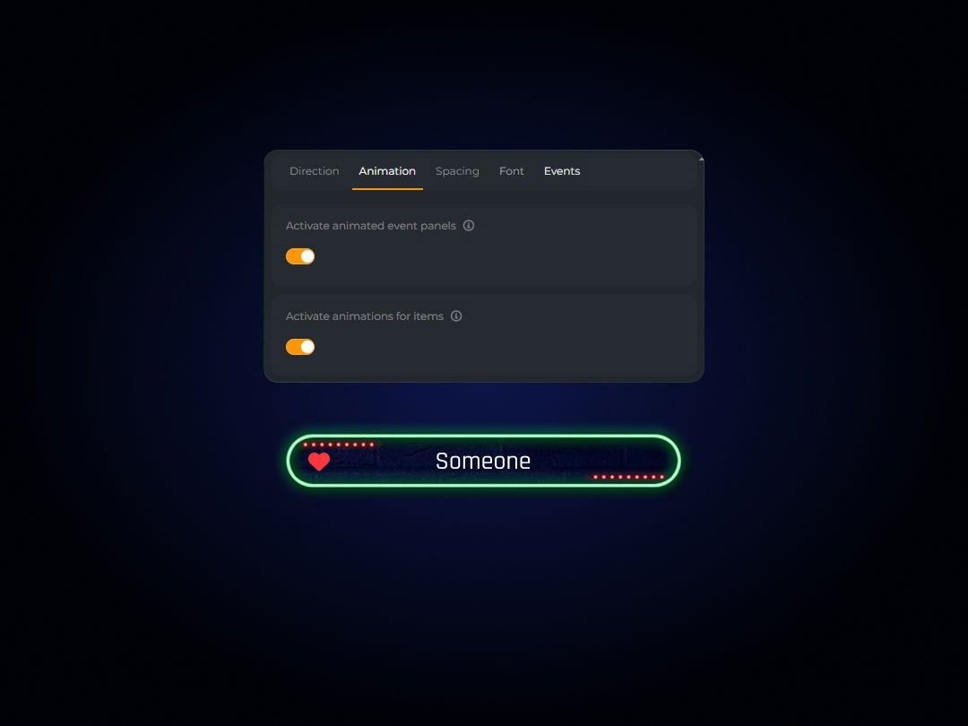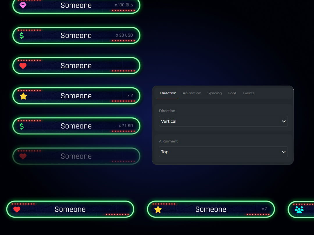 Customize your layout with horizontal or vertical display options. Whether stacked or stretched across your overlay, the neon-lit event list adapts effortlessly to your design.