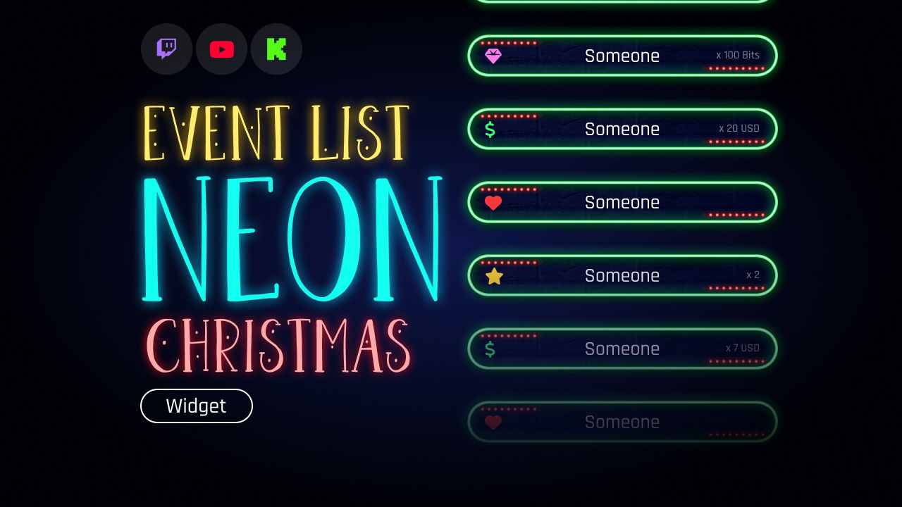 Showcase all your latest live events—follows, subs, donations, and more—across Twitch, YouTube, and Kick. Each update bursts onto your screen with vibrant neon glow.